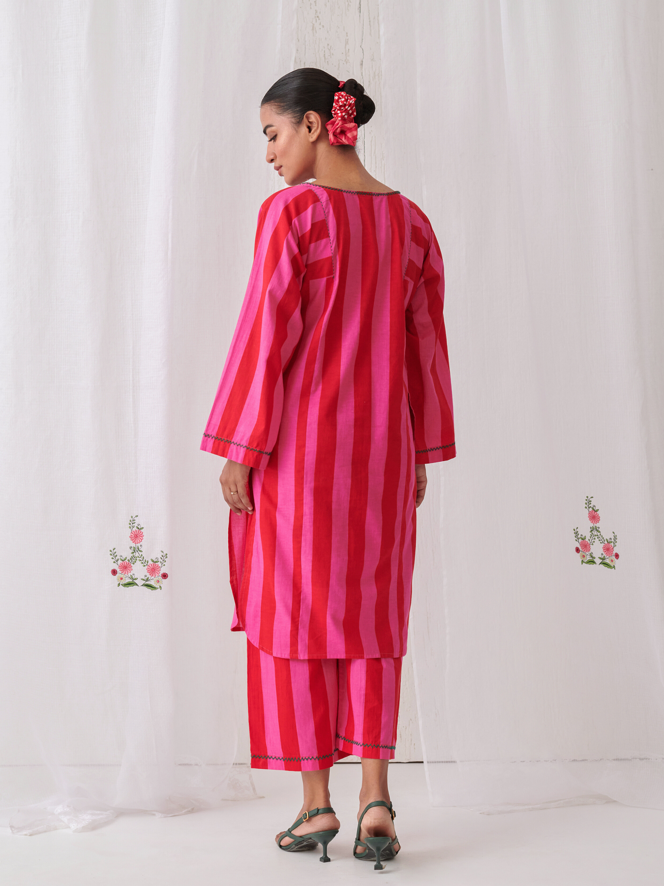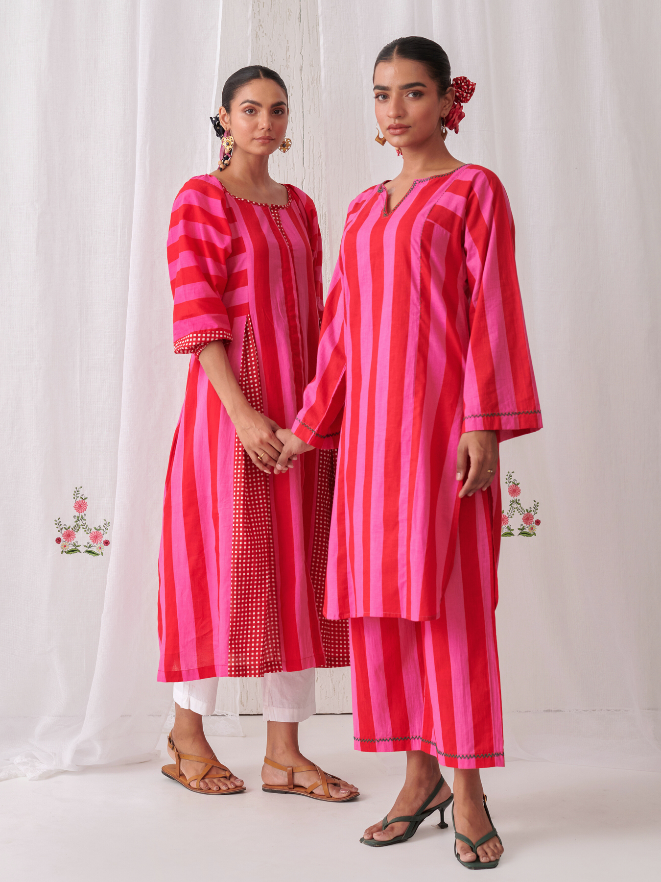 Brighten your wardrobe with this short phiran-style kurta, crafted in bold pink and red striped cotton. Featuring a keyhole neckline and hand-stitched contrast details, it's paired with matching pants adorned with the same accents on the hemline for a vibrant, coordinated look.