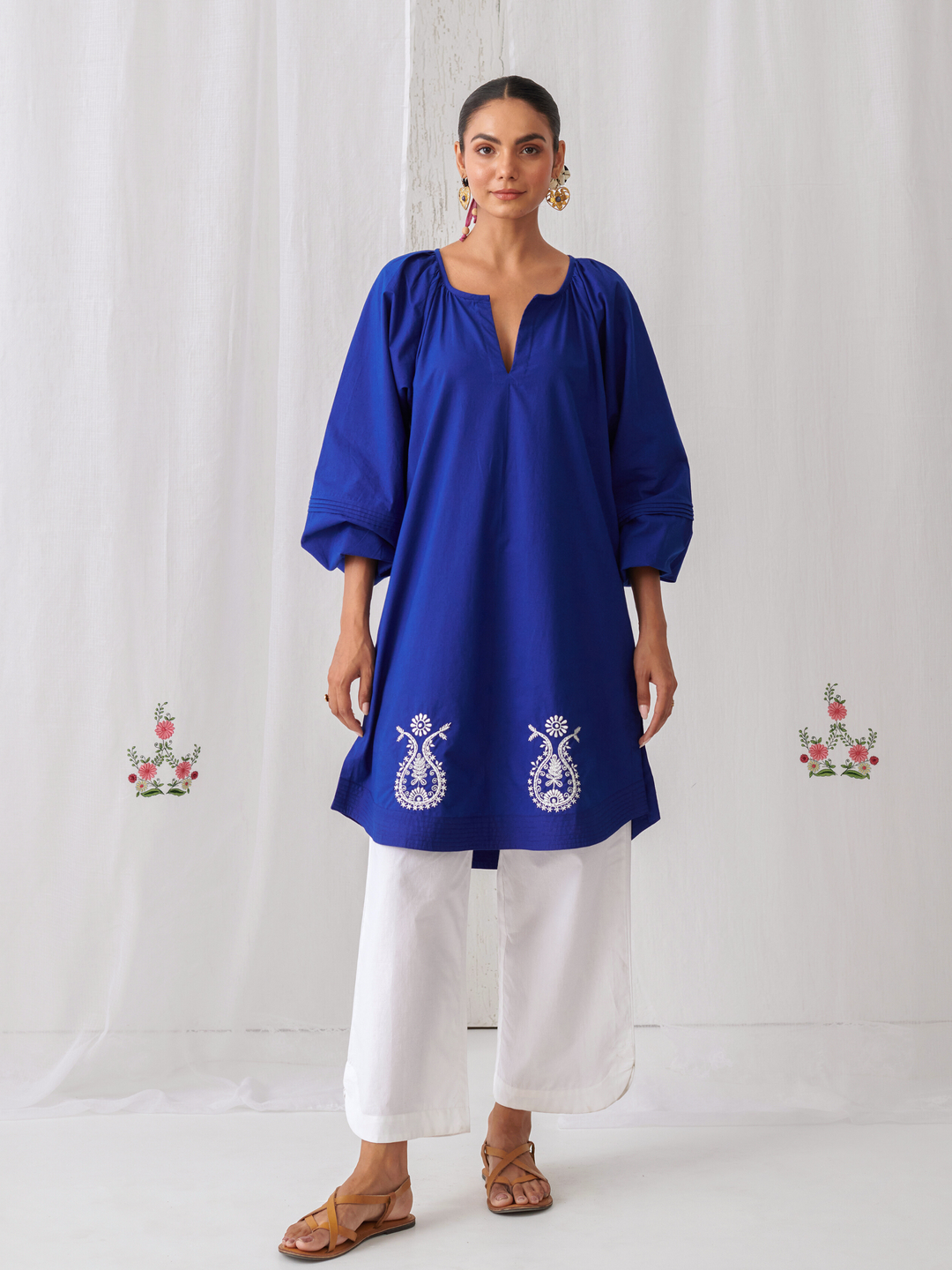 Royal Blue Gathered Short Kurta Paired With Curved Hem White Pants