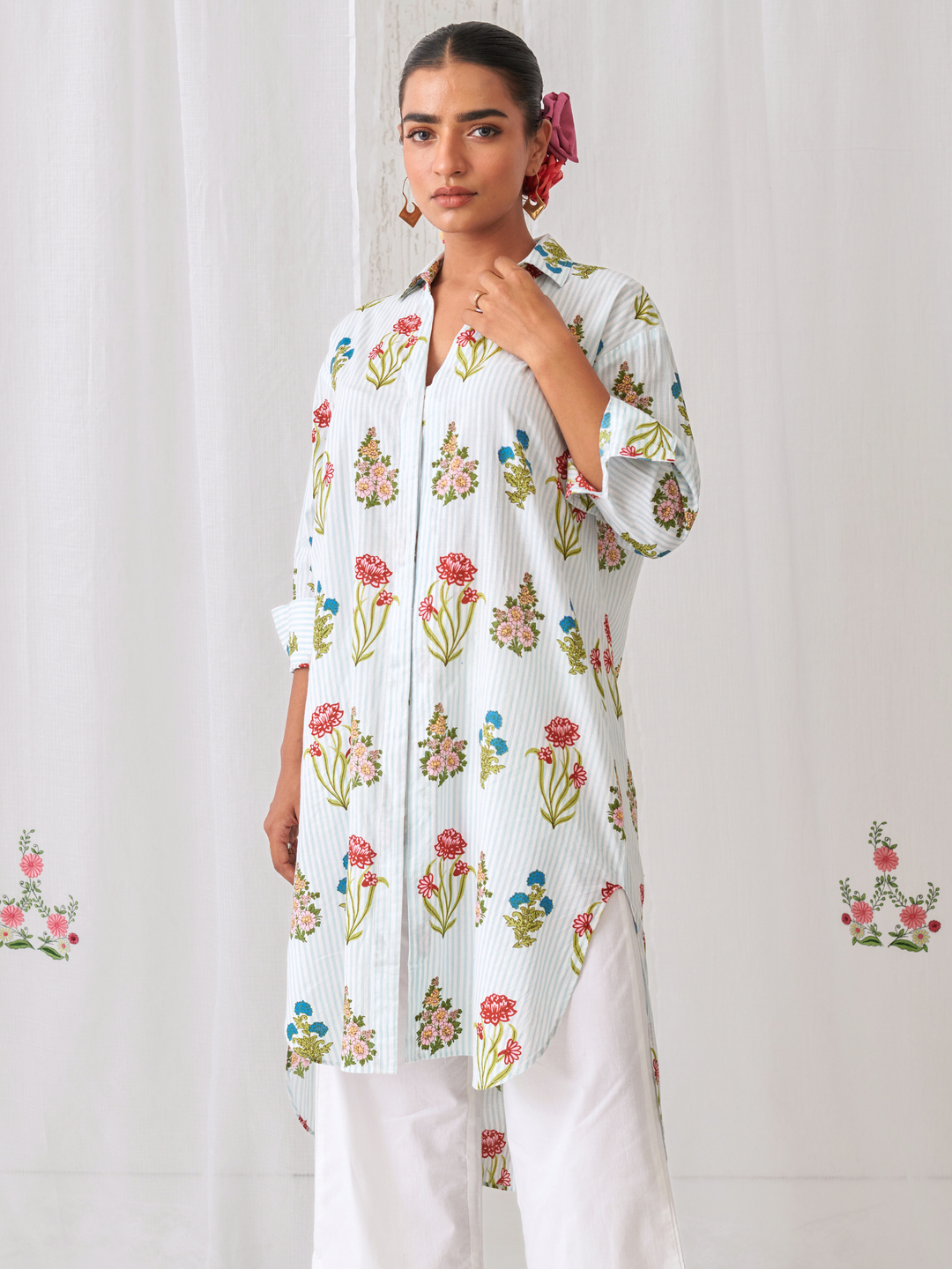 Aqua Floral Shirt Style Kurta Paired With Curved Hem White Pants