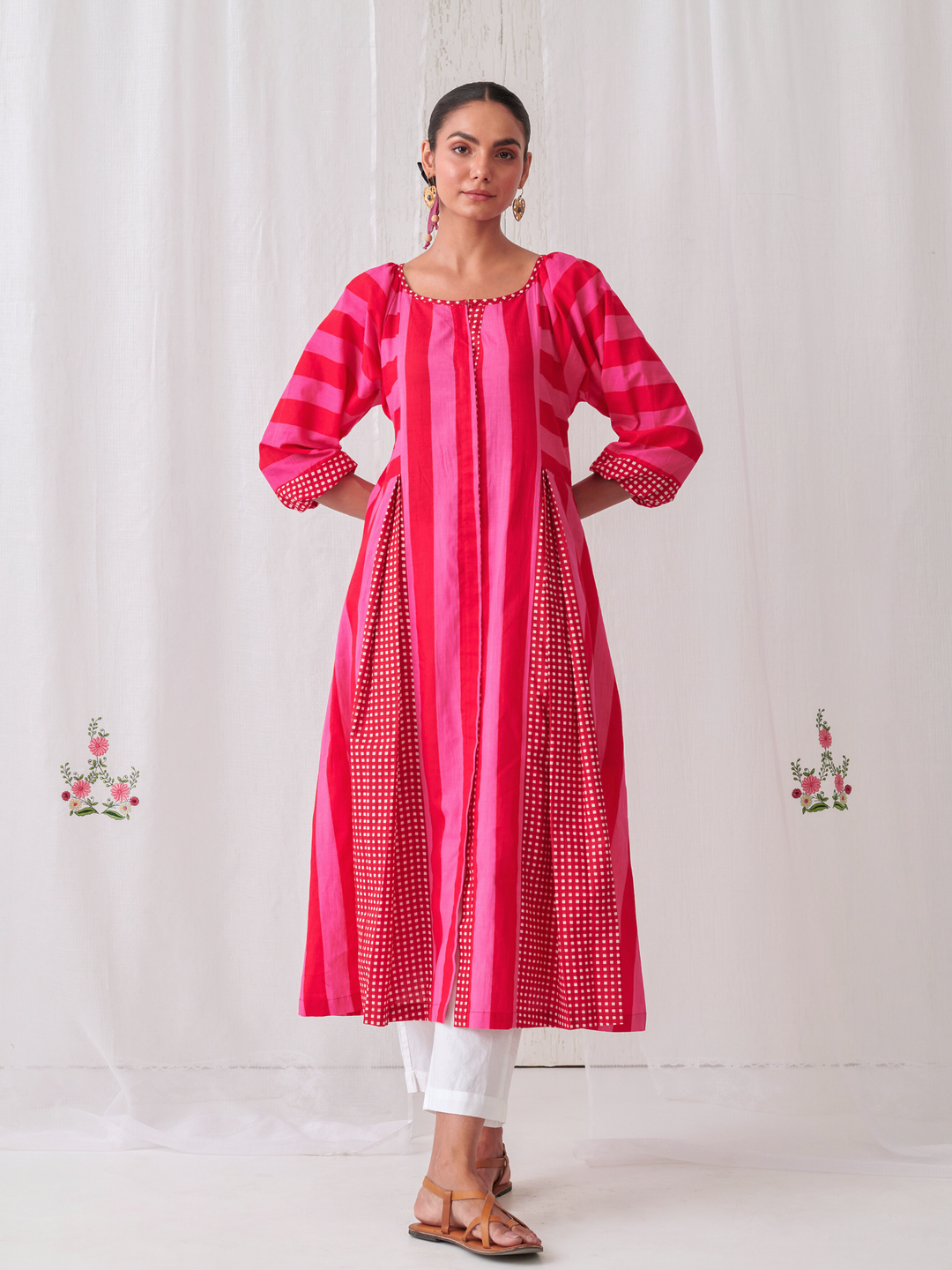 Pink & Red Striped Box Pleat Inserts Kurta Paired With Straight White Pants