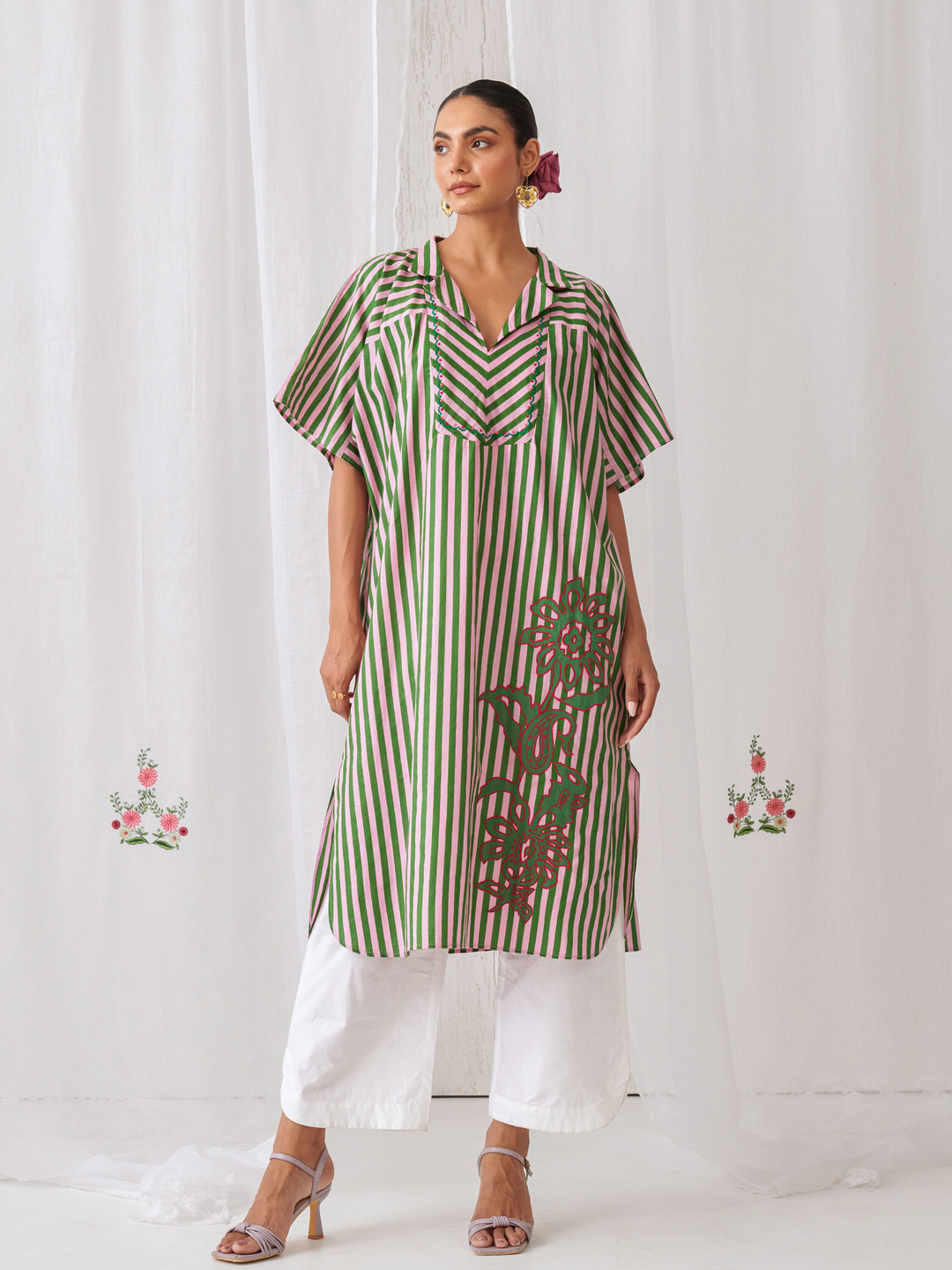 Pink & Green Striped Kaftan With Embroidery Paired With White Pants